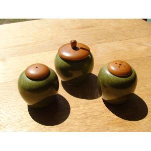 抹茶のような緑色とチークの木目の色がとてもマッチしています。小さい2つはそれぞれ塩入れと胡椒入れ、大きいサイズのものはマスタード入れです。蓋の形はスプーンが入れられるようになっています。